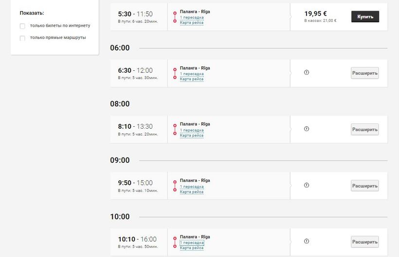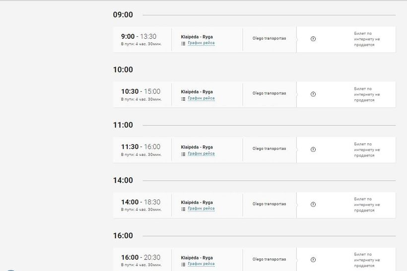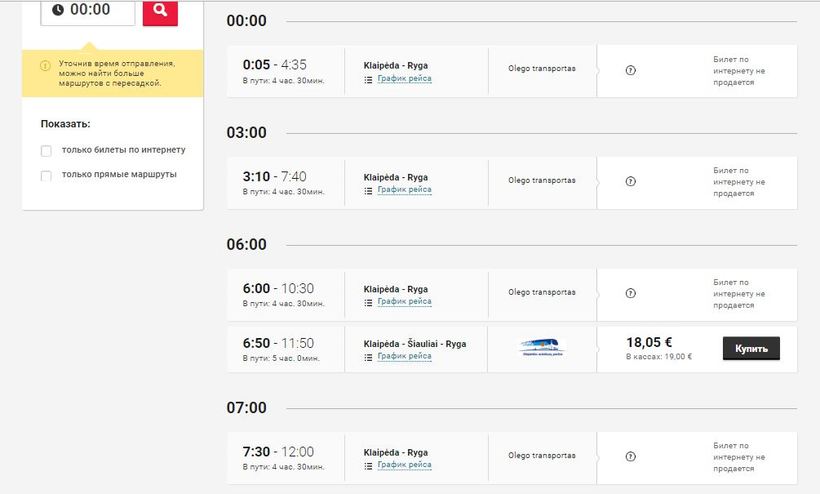 И это на вечерний скриншот не поместился еще автобус, отходящий в 23:55. Есть, конечно же, и автобусы дневные, просто не хочу превращать текст в скриншот-лист. А теперь об автобусах из Клайпеды в Ригу. У них расписание в начале дня вот такое: