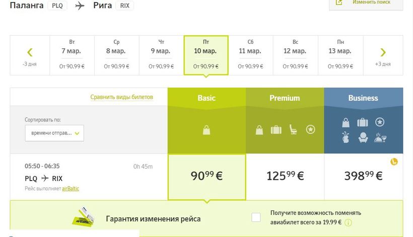 В Паланге есть аэропорт, позволяющий совершить, пожалуй, наиболее быстрое путешествие в Ригу. Вот здесь есть немножко о нем, и о том, какой транспорт связывает его с Палангой. Для тех кому лень кликать, скажу так: либо поездка на автобусе, либо протопать 6 км пешком. Авиарейсы по данному направлению предлагает компания Air Baltic. Вот скриншот с ее сайта: