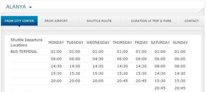 Для тех туристов, которые собираются вылетать из Аланьи через аэропорт Газипаша, ниже я поместила расписание рейсов автобусов Havas из Аланьи в аэропорт.