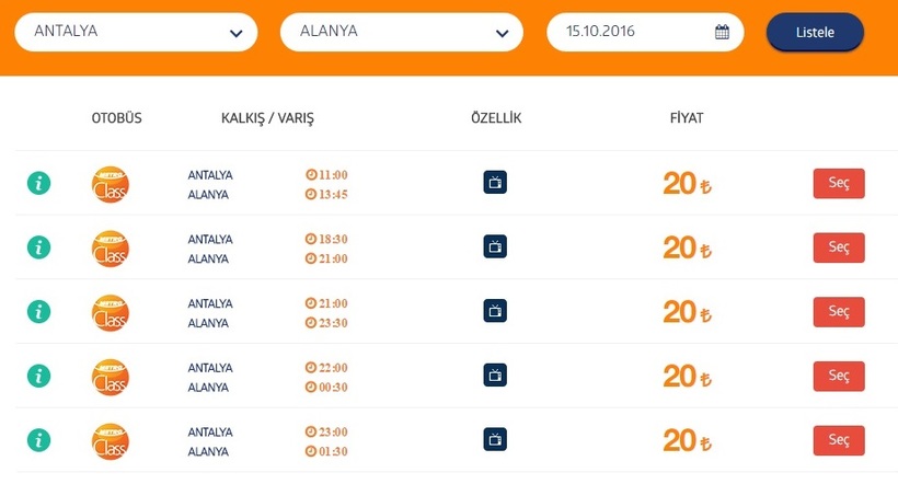 Автобусы оборудованы креслами с мониторами для просмотра фильмов. Правда весь ассортимент на турецком языке :(. Если едете в дневное время, то садитесь с правой стороны. Это даст возможность смотреть на море. При ночной поездке садитесь где хотите, так как все равно ничего не увидите :). За два с половиной часа Вы доедете до Аланьи.