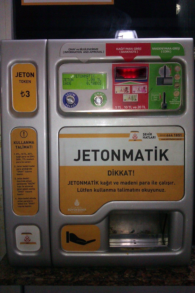 В здании аэропорта есть специальные терминалы. Пользоваться ими проще простого, мне кажется даже ребенок без труда разберется, как там жетончик купить. Сам терминал называется JetonMatik.