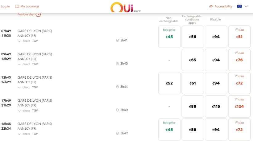 Ниже приведена информация о том, сколько часов вам потребуется, чтобы добраться от Парижа до Анси, а также приведена примерная стоимость проезда (средняя цена билета) на том или ином виде транспорта.