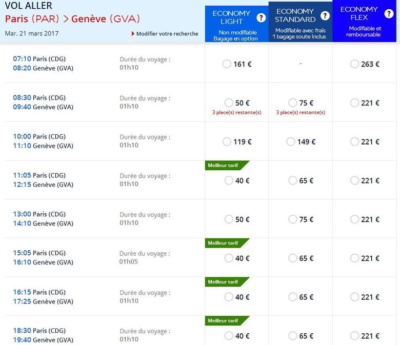 Компания Airfrance совершает беспересадочные полеты от аэропорта Шарля де Голля (на Руасси-ан-Франс) до Женевы (по адресу Route de l'Aéroport 21). Всего в день есть 9 рейсов, начиная с 07:10 и заканчивая 20:45. Интервал между вылетами от 1 ч до 2 ч 15 мин. Когда я ищу подходящие авиарейсы, пользуюсь разными сайтами, вот этот неплохой, к примеру. Полет получается недолгий, всего 1 ч 10 мин.