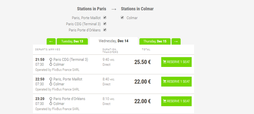 По маршруту Париж - Кольмар доступен один автобус, который отправляется из аэропорта Шарль-де-Голль в 21.50, останавливается он в Porte Maillot в 22.50, в Porte d'Orleans в 23.20. Прибытие в Кольмар на остановку рядом с железнодорожным вокзалом на Place de la Gare.