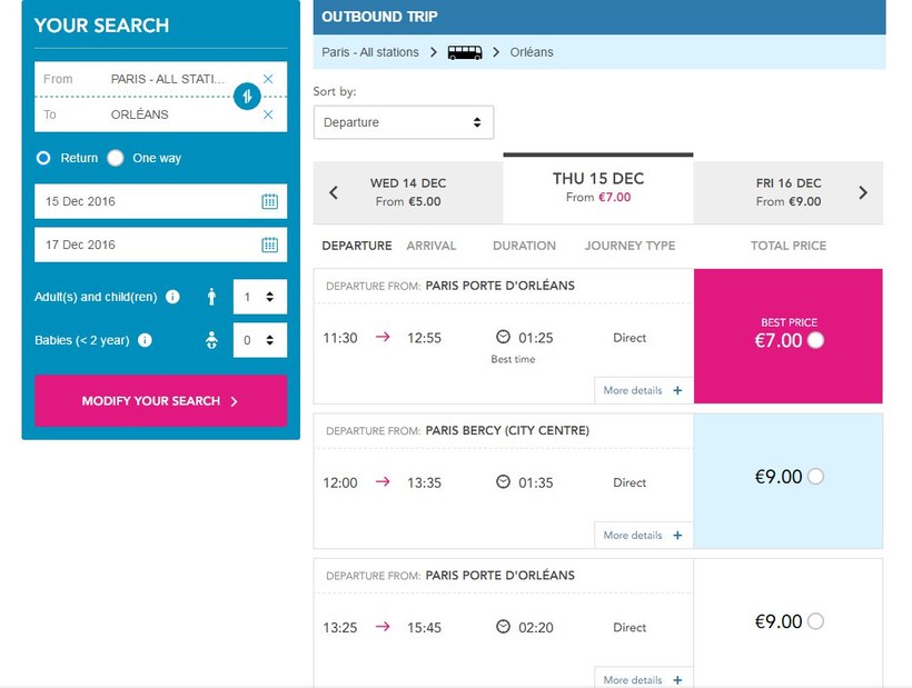 - Автобусы от Ouibus отходят с Porte d'Orleans в 11.30, 13.25, 18.20, 20.00; с Bercy в 12.00; с Orly-Sud в 14.15, 19.10.