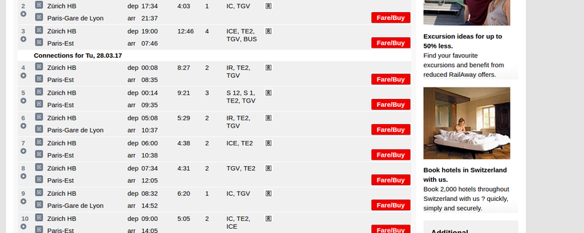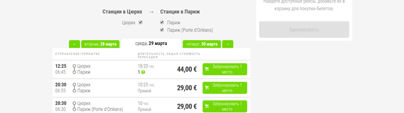 Как видно, движение начинается достаточно рано, но вот и заканчивается оно в 19:00, что не всегда является удобным. Прямой поезд в сутки только один, он отправляется в 15:34 с главного вокзала Цюриха, расположенного здесь:И прибывает в 19:37 на парижский вокзал Gare de Lyon, который находится вот тут:На него же приходят и некоторые рейсы, предусматривающие пересадки. Большинство же рейсов с пересадками приходят на другой вокзал, Paris Est, который находится вот тут: В основном пересадок 2, таких рейсов больше всего. Пересадки в этом случае делаются в Базеле и Страсбурге.