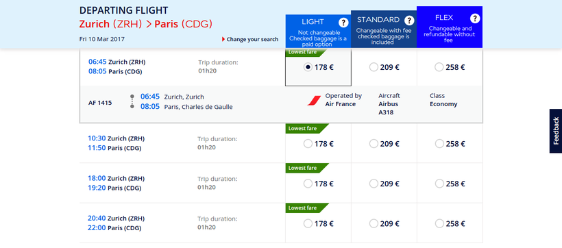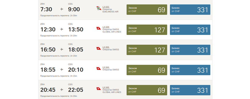 В Цюрихе имеется аэропорт, почитать о нем и о транспорте, который поможет туда доехать можно вот здесь. Рейсы в Париж осуществляют две авиакомпании. Первая это Swiss Air и ее смежники. Свериться с расписанием можно на сайте авиакомпании, а также можно посмотреть на скриншот: