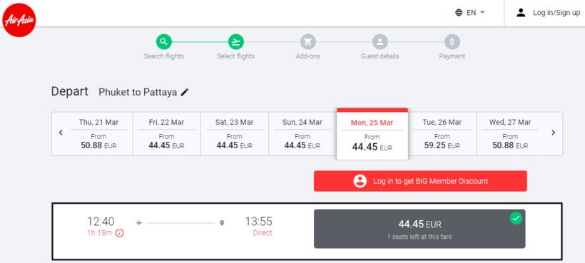 Расстояние между городами внушительное, поэтому перелет я считаю хорошим вариантом. Я нашел две авиакомпании, которые совершают прямые рейсы по этому маршруту. Air Asia с понедельника по субботу предлагает один рейс в 12:40. По воскресеньям рейсов два: в 12:10 и 17:55. Лететь совсем недолго, всего 1 ч. 15 мин.
