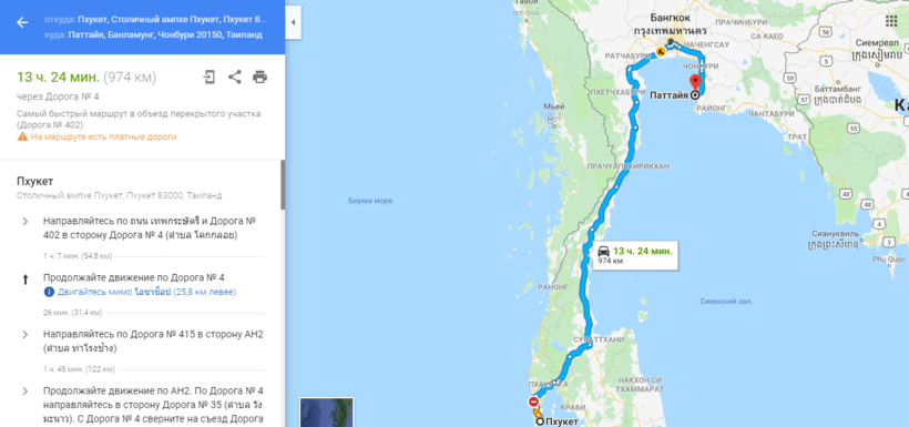 Маршрут проходит преимущественно по дорогам № 4 и № 35. Чисто теоретически добраться до Паттайи можно за 14 часов, но это без учета остановок и возможных пробок. Трассы в Таиланде в основном с хорошим покрытием. Стоимость бензина сравнительно адекватная — 35 батов (0,82 евро). Арендовать авто легко на подобных сайтах. Желательно делать это заранее, самые выгодные предложения быстро разбирают. Прокат машины в Пхукете обходится от 1100 батов (25 евро).
