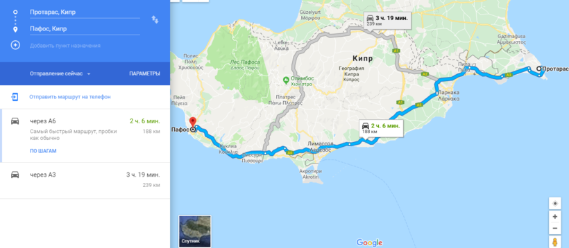 Не удалось проложить автомобильный маршрут из Протараса до Пафоса - они находятся на разных материках. Для путешествий между ними рекомендуем воспользоваться самолетом.