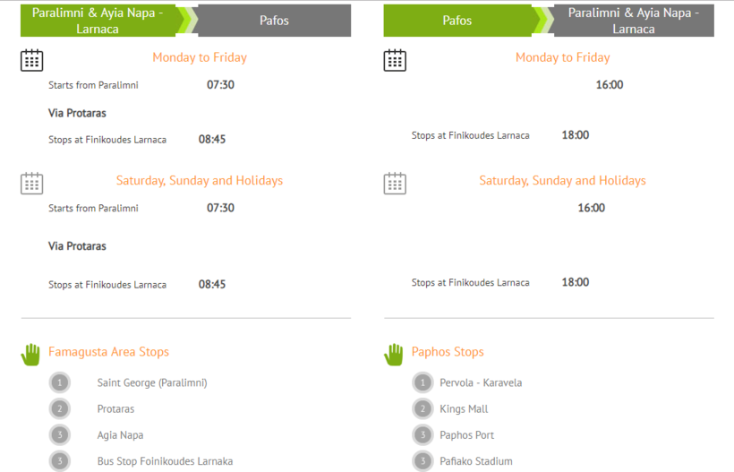 К сожалению, прямыми перевозками на этом маршруте занимается только одна компания, Intercity Buses. Да и то, у нее есть лишь один рейс в сутки. Автобус выезжает из Паралимни (10 км от Протараса) в 07:30.