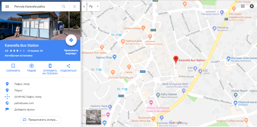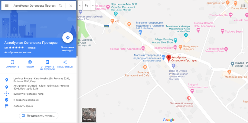 Минут через 10–15 он будет проезжать через Протарас, но я бы рекомендовал быть на месте немного раньше. Остановка, на которой нужно ждать автобус, находится здесь: