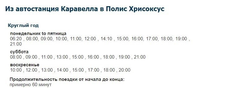 Из центральной части Пафоса, а именно от главного автовокзала, который называется Karavella Bus Station, ежедневно курсируют прямые автобусные рейсы в этот небольшой городок. Я лично ездила в Полис на автобусе № 645. Время отправления (из Пафоса в Полис) смотрите на скриншоте.