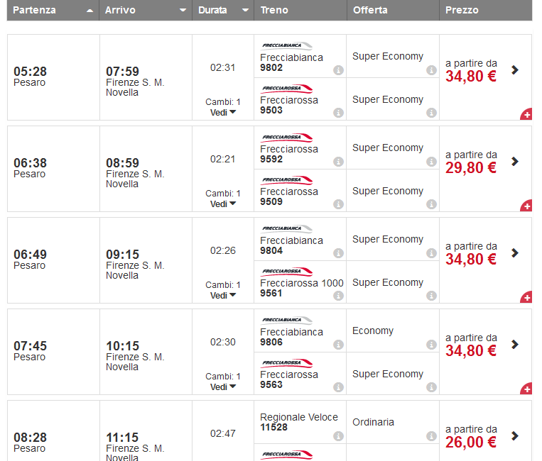 Ниже приведена информация о том, сколько часов вам потребуется, чтобы добраться от Пезаро до Флоренции, а также приведена примерная стоимость проезда (средняя цена билета) на том или ином виде транспорта.