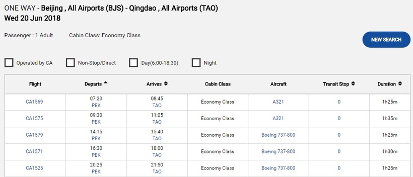 Между Пекином и Циндао летают самолеты от нескольких местных авиакомпаний. В Интернете мне удалось найти три - национальный перевозчик Air China,