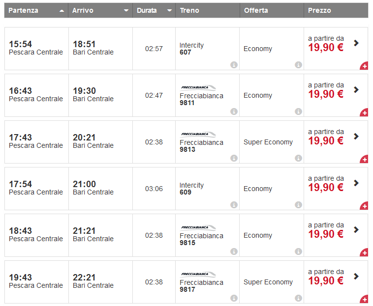 Стоимость билета на практически все составы одинакова. Проезд из Пескары в Бари обойдется в 19,90 евро.