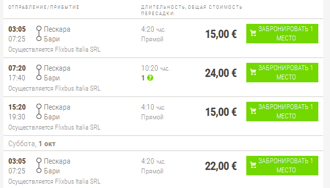 Автобусы FlixBus выезжают в Бари три раза в день: в 03.05, 07.20 (из-за пересадки поездка занимает слишком много времени) и в 15.30. В дороге нужно будет провести 4 часа (если ехать с пересадкой, то аж 10).