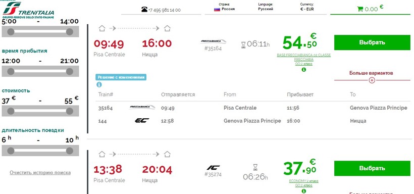 Со станции Pisa Central Station несколько раз в день ходят поезда в Геную (станция Genova Piazza Principe). К примеру, отправление в 9.49 и 13.38. В Генуе нужно сделать пересадку на другой поезд, который идет до Ниццы. Трансфер займет всего 12 минут. Поезда делают остановку почти каждые 5 минут. Из-за этого на дорогу уйдет довольно много времени – больше 6 часов.