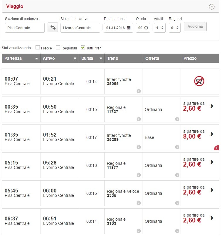Ехать из Пизы в Ливорно - нечего делать. Советую воспользоваться поездом, они ездят часто с 5:00 до 22:00 и еще есть пару рейсов после полуночи, но для поездки на паром они не пригодятся. Расписание можно посмотреть на сайте Trenitalia, билет на поезд стоит от 2,6 евро. По этому маршруту ездят пригородные поезда и скоростные, но поездка занимает все лишь 15 минут независимо от типа поезда.
