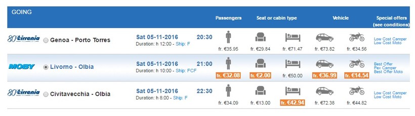 Билет без места на пароме Moby стоит 32 евро, если ходите место в кресле, доплатите еще 2 евро. Место в самой дешевой каюте стоит 80 евро. За легковой автомобиль вы заплатите 36 евро, но у нас, например, не было ни прицепа, ни дома на колесах, а за них придется еще доплатить.