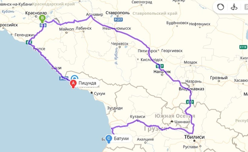 Из-за конфликта между Абхазией и Грузией приходится делать большой крюк, чтобы добраться в Батуми. Маршрут прокладываю через такие города (расстояние по трассе — 1400 километров):