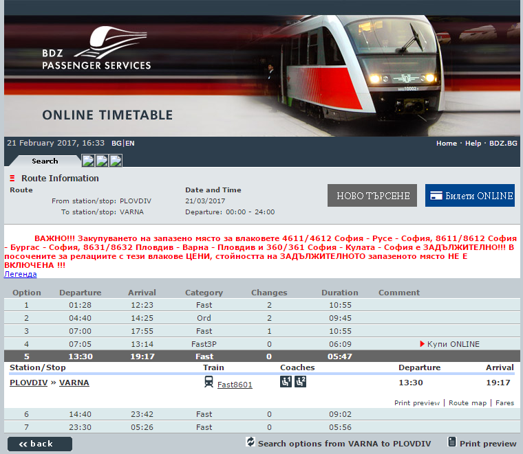 Для ознакомления с расписанием можно заглянуть на сайт БЖД – болгарских железных дорог. Там же можно попробовать купить билеты, но в моём случае онлайн продажа была доступна только на один поезд из четырёх. Переживать из-за этого не стоит, без билета вы всё равно не останетесь – на вокзале Пловдива работают кассы, кроме того, можно приобрести билеты у контролёра прямо в поезде.