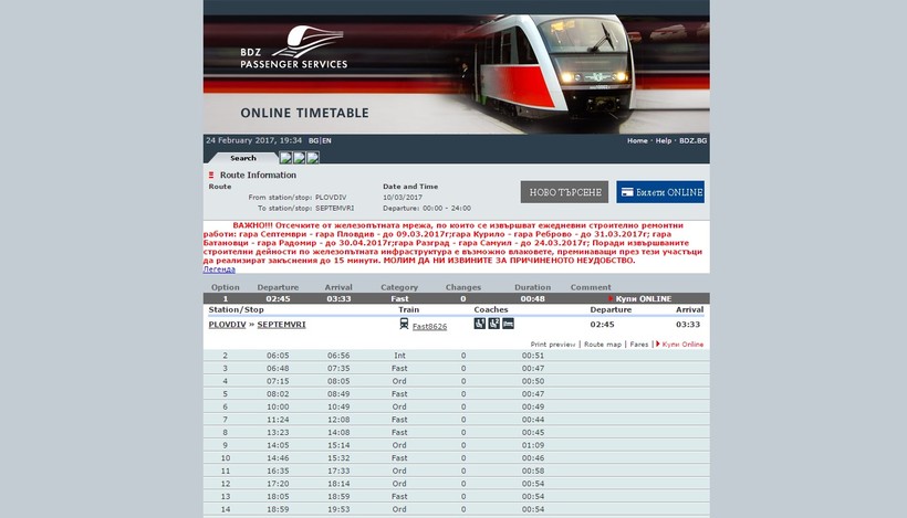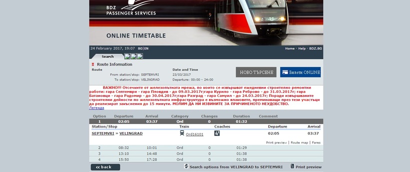 Прямого железнодорожного сообщения между Пловдивом и Велинградом нет. Ехать придется с пересадкой на станции Септември. Вот расписание поездов из Пловдива в этом направлении.