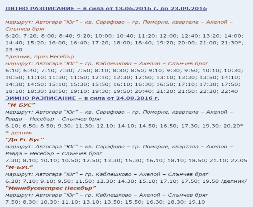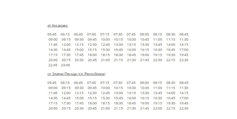 Добираться до Солнечного берега необходимо с пересадкой на автовокзале Варны. В этом направлении от терминала аэровокзала ежедневно курсирует автобус №409. При выборе этого варианта поездки следует знать один нюанс. В Болгарии на промежуточных остановках автобусов указано расписание со временем отправления автобуса от начальной остановки и его прибытием в конечный пункт назначения. Это не совсем удобно, так как приходится угадывать время прибытия автобуса к нужной Вам остановке. Например, вот расписание автобуса №409 из Аксаково в направление Варны через аэропорт.