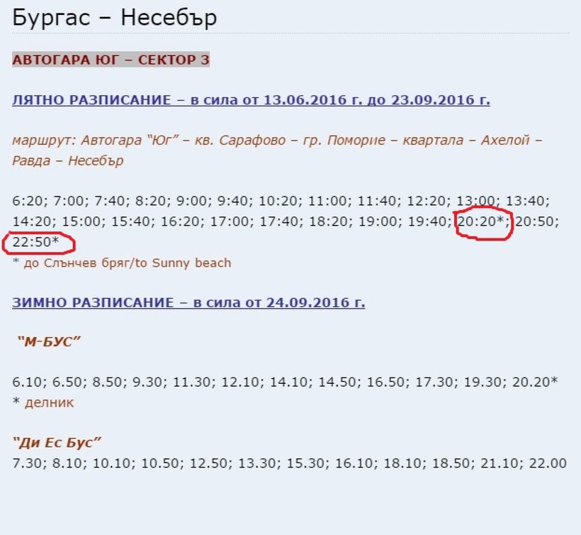 Красными кружочками отмечены рейсы, на которых можно доехать до Солнечного берега. Или же можно выйти в Несебре и оттуда за 15-20 минут доехать в Слънчев бряг. Здесь Вы сможете найти всю необходимую информацию по маршруту от Несебра до Солнечного берега.