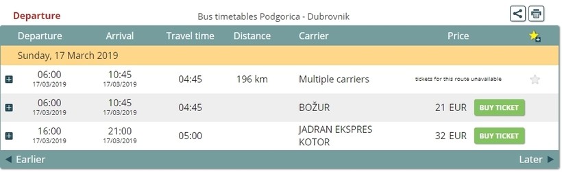 Ниже приведена информация о том, сколько часов вам потребуется, чтобы добраться от Подгорицы до Дубровника, а также приведена примерная стоимость проезда (средняя цена билета) на том или ином виде транспорта.