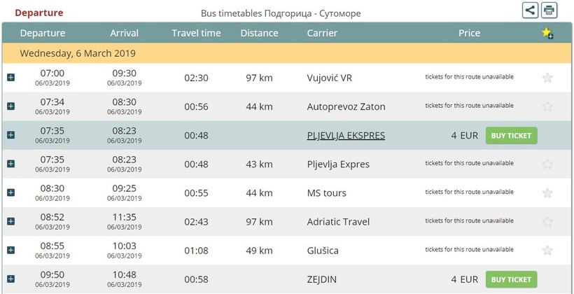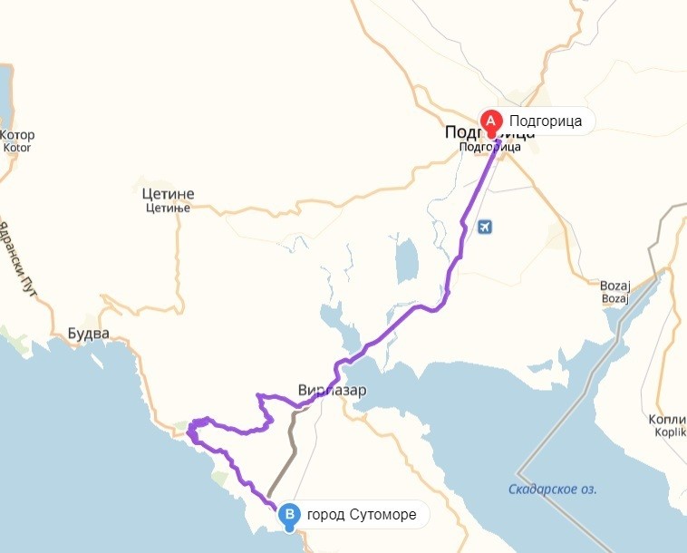 Ниже приведена информация о том, сколько часов вам потребуется, чтобы добраться от Подгорицы до Сутоморя, а также приведена примерная стоимость проезда (средняя цена билета) на том или ином виде транспорта.