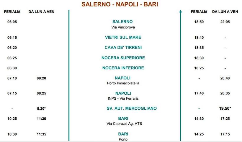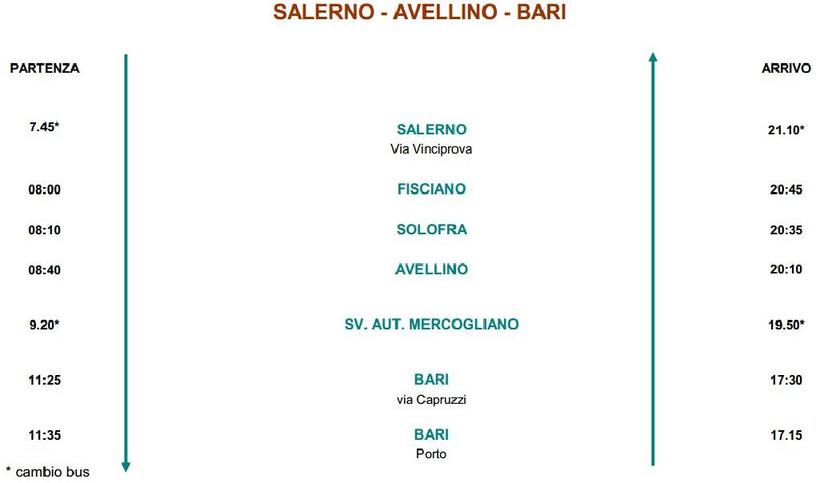 Компания Sitasud Trasporti совершает 2 рейса в день из Салерно (с остановки на Via Leonino Vinciprova) до Бари (первая остановка в городе на Via Capruzzi Ag. ATS, а вторая - порт). Первый автобус отправляется в 06:05, а второй - в 07:45, в пути они 4,5 ч и 3 ч 50 мин соответственно. Разное время в дороге из-за разных маршрутов, так как первый автобус идет через Неаполь, а второй - через Авеллино.