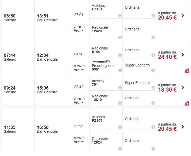 По данным сайта trenitalia.it можно выехать из Салерно по направлению к Бари (вокзал находится на Piazza Aldo Moro) с пересадкой, начиная с 06:50 и до 17:47. Обратите внимание, что некоторые рейсы содержат не только поезд, но и автобус. Интервал между отправлениями примерно один-два часа, а время в пути, учитывая пересадки, от 4:20 до 7 часов.