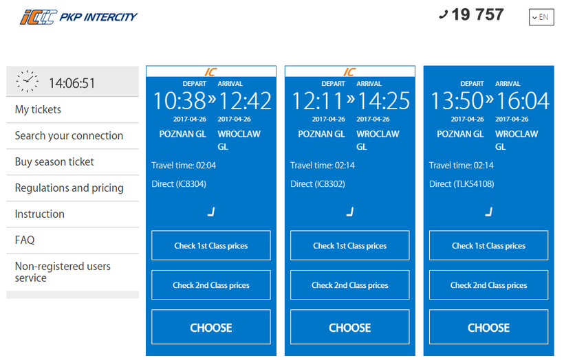 Билеты на поезда TLK и IC можно купить через Интернет на официальном сайте польских железных дорог. Билеты на электричку R приобрести онлайн нельзя, только на вокзале – в кассах или специальном автомате.