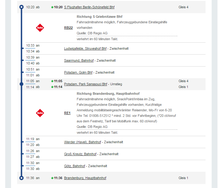 Ниже можно просмотреть остановки по пути к Бранденбургу. При первой поездке поезд RB22 делает 4 остановки, а далее поезд RE1 доезжает до цели через 3 остановки. Это будет конечная остановка этого поезда.