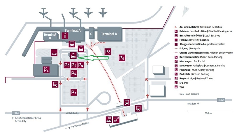 У входа к терминалу А можно обнаружить остановку для автобусов TXL, которые c коротким интервалом увозят гостей столицы из аэропорта к Центральной станции Берлина. На схеме аэропорта место остановки отмечено зеленым треугольником.