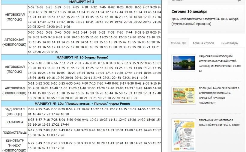 А что касается прямых автобусов с Полоцка, то нужны маршруты №5, 10, 10А. Первый рейс доступен уже в 05:52, а последний выезжает в 01:06. Интервал движения — от пятнадцати до двадцати минут. Короче, уехать будет чем, за такое не стоит переживать.