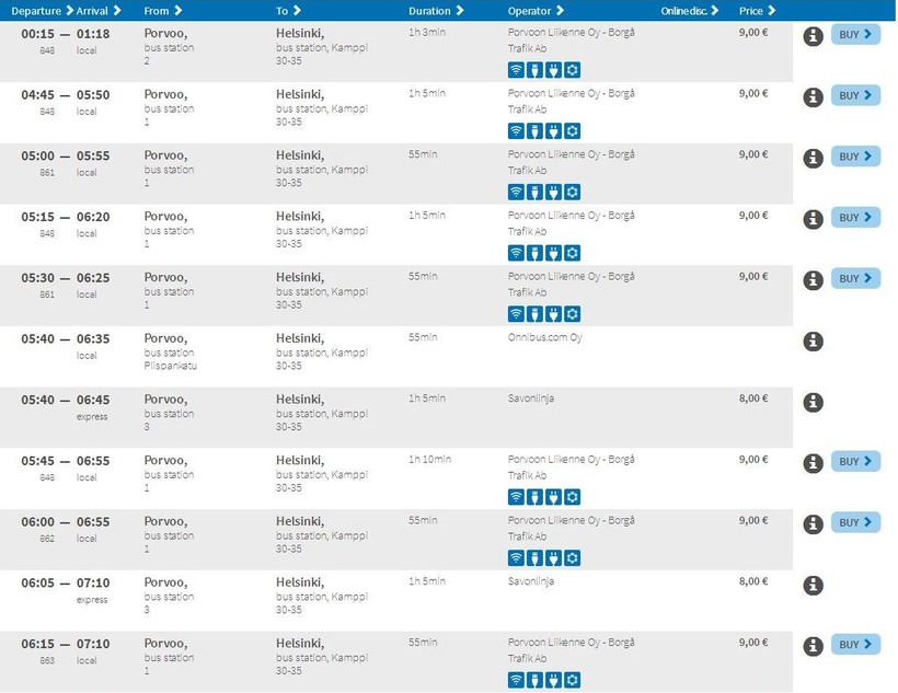 Движение начинается с четырех утра и заканчивается в двенадцать ночи. Ждать следующего автобуса практически не придется. Пришел, купил билет и сразу поехал, так как в час есть по несколько рейсов. Сервис в салонах автобусов разный, зависит от перевозчика. Встречаются вайфай, розетки, кондиционеры, но не везде. Через час пути пассажиров привозят на автовокзал Кампи в Хельсинки.