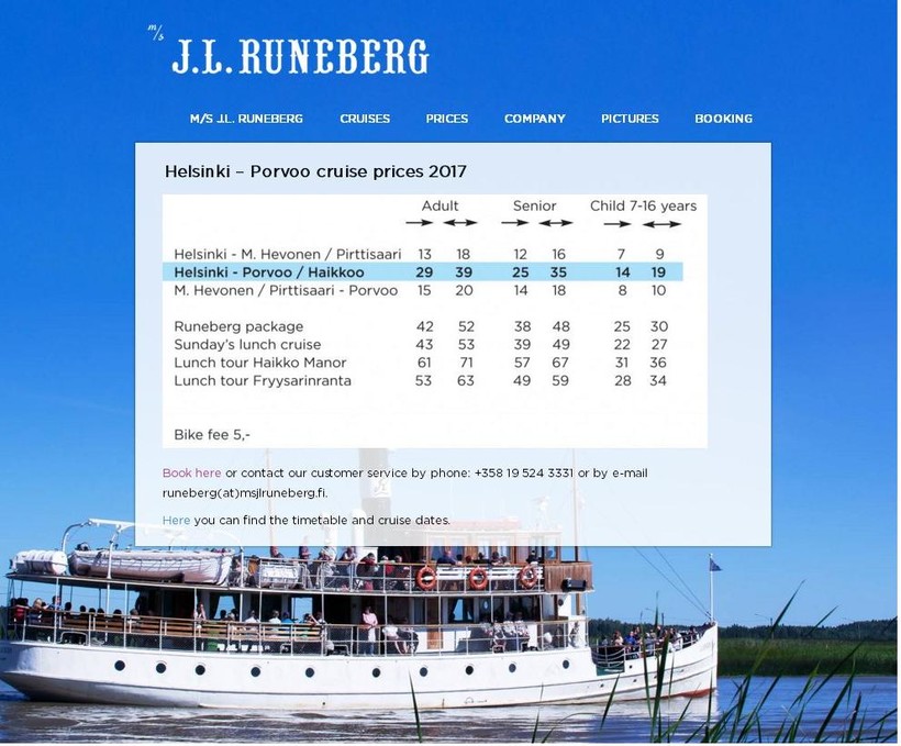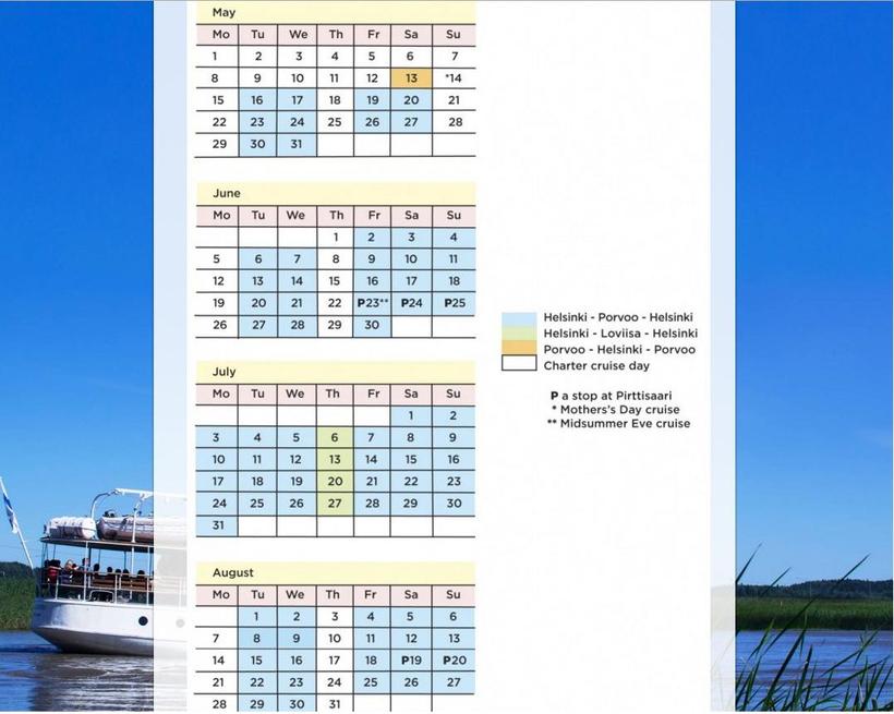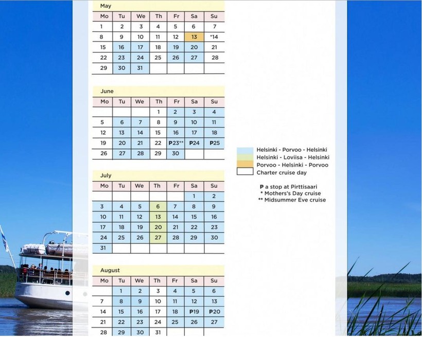 Самый романтичный, но самый долгий способ попасть в Хельсинки – это кораблик. Он идет целых 3,5 часа, но по пути открываются обалденные виды, и если вы не торопитесь, можете устроить себе такую прогулку. Удобно тем, кто решил посетить Порвоо из Хельсинки одним днем, так как отправление из столицы Финляндии в 10 часов, а обратно из Порвоо – в 16 часов. То есть, специально выделено время на осмотр этого средневекового городка – 2,5 часа. Но, помимо целого «круиза» можно оплатить билет лишь в одну сторону, если вам так удобнее. Рейсы есть не каждый день (ниже на скрине видно расписание на 2017 год) и только в теплое время года – с мая по середину сентября. Утром кораблик отправляется из Хельсинки от Linnanlaituri quay (Южной гавани).