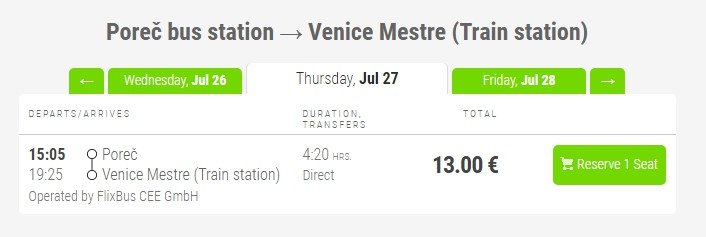 Относительно железнодорожного транспорта, то прямого сообщения между этими городами нет. Если и путешествовать поездом, то добраться в Венецию можно только с Триеста, куда из Пореча стоит ехать на автобусе. Но, когда я посчитала, сколько времени, сил и даже денег придется потратить на подобное путешествие, то решила, что такой вариант неактуален.
