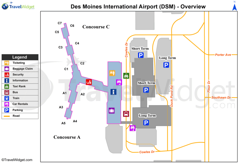 Аэропорт - центральный для города Де-Мойн. Если у вас есть время, Вы можете побывать в этом городе, а уже после доехать до Айовы. В Де-Мойн ходит автобус каждые полчаса и стоит 2 доллара. Вас также может забрать такси, арендованное авто, лимузин, вертолет.