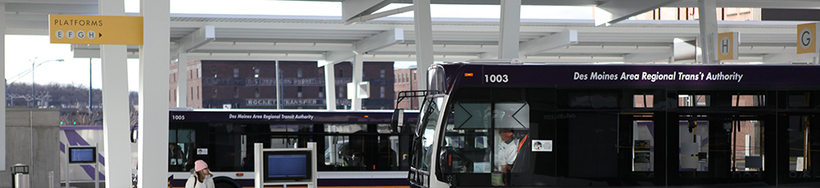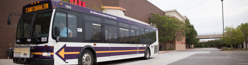 Если решили ехать на автобусе, нужно заранее забронировать билет или ловить автобус и платить водителю. Выйдя из терминала, Вы увидите по левой стороне временную парковку. От Short Term Parking Вам нужно дойти пешком до перекрестка Fleur Drive и Porter Ave. Там ходит автобус, который довезёт вас до Dart Central Station (DART) в Де-Мойне.