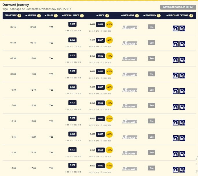 Цена билета на прямой рейс компании Альса - 33 евро. Поездка с пересадкой в Виго значительно дешевле: переезд Порту-Виго обойдется в 12 евро, билет из Виго в Сантьяго стоит 8 евро.
