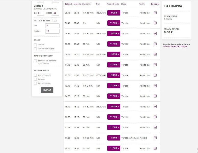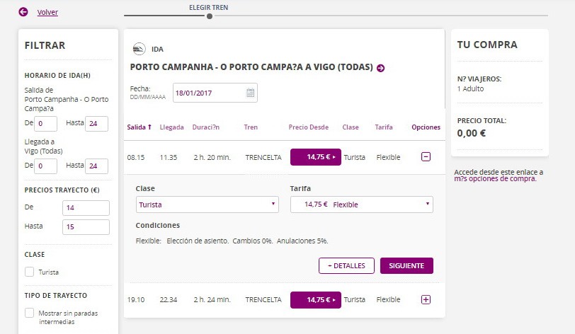 Билет из Порту в Виго стоит 14,75 евро. Из Виго в Сантьяго цена зависит от категории поезда, но разница незначительна: от 8 до 11,1 евро. Таким образом, поездка на поезде обойдется немного дороже, чем с аналогичной пересадкой на автобусе.