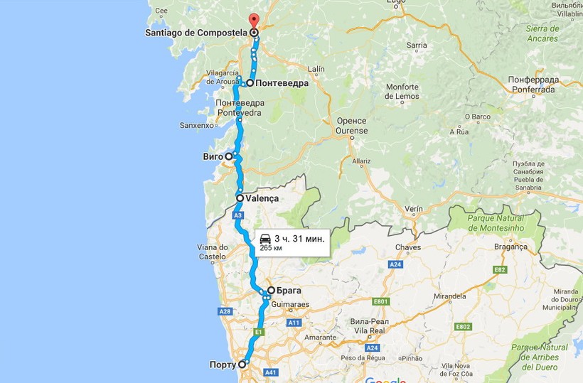 Порту — Сантьяго-де-Компостела — маршрут на карте