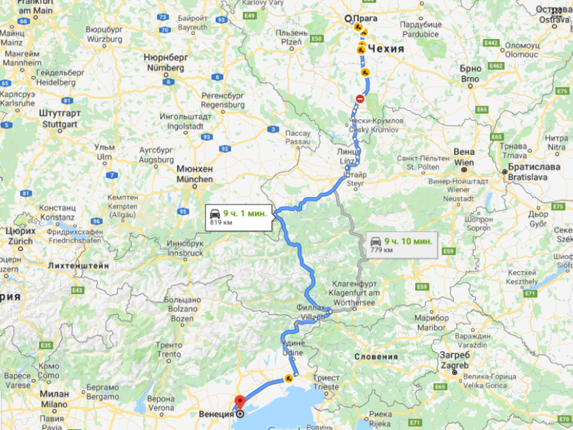 Прагу и Венецию разделяют 780 км, проехать такое расстояние на машине можно за 9 часов.