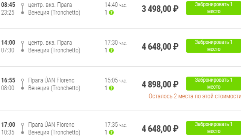 Ниже приведена информация о том, сколько часов вам потребуется, чтобы добраться от Праги до Венеции, а также приведена примерная стоимость проезда (средняя цена билета) на том или ином виде транспорта.