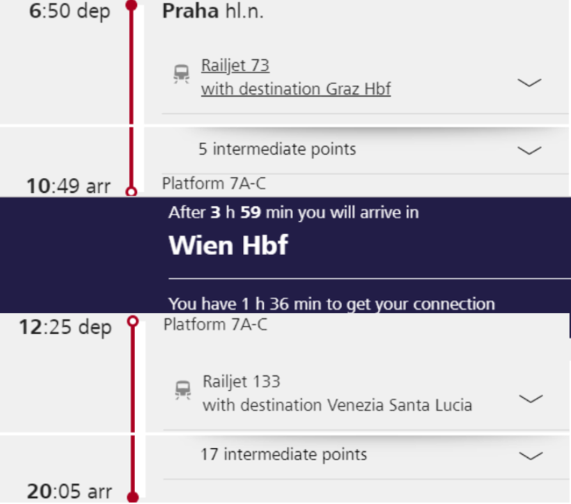 - выезд из Праги в 06:50 и прибытие в Вену в 10:49;