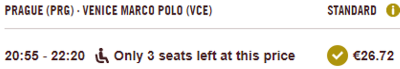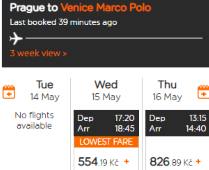 Компания EasyJet осуществляет рейсы из Праги в Венецию по понедельникам, средам, пятницам, субботам и воскресеньям в 17:20, и по четвергам в 13:15.