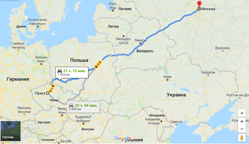 Признаюсь, это мой самый любимый вариант путешествия в Прагу. Здорово ни от кого не зависеть во время поездки. Когда проезжаешь красивый городок, можно сделать остановку, чтобы прогуляться. Если своего автомобиля нет, то его всегда можно взять в аренду на подобном сайте. Ехать, конечно, немало, почти 2000 километров. Я советую остановиться где-нибудь на ночевку. Где именно? Это зависит от того, какую трассу вы выберете для поездки. Есть 2 варианта построения маршрута. Первый — двигаться по трассе М1, второй — по трассе S8 и частично по М1. Я всегда выбираю для поездок первый вариант. Эта трасса короче, она проходит через территорию Польши и Республики Беларусь. Если выбирать второй вариант, то получается крюк.